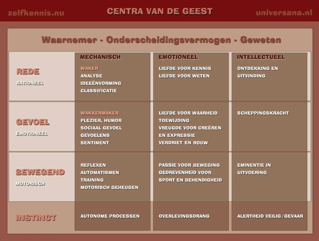 Elk Centrum is in drie lagen te verdelen. Elk Centrum heeft een mechanisch deel, een emotioneel deel en een intellectueel deel. De mate van wakkerheid van de Waarnemer in ons, de zuiverheid van ons onderscheidingsvermogen en de ‘bereikbaarheid’ van ons geweten bepalen gezamenlijk in hoeverre deze schematische voorstelling van onze geest zelfreflectief kan wordt waargenomen en begrepen. Naarmate onze Centra zich zuiveren, worden het emotionele en intellectuele deel steeds bepalender voor de kwaliteit en verfijning van ons denken, spreken en handelen. De mechanische delen van onze drie beïnvloedbare Centra worden hierdoor dus geüpgraded. Toch bevindt zich in het mechanische deel van ons Gevoel-centrum onze wakkermaker, die ons op momenten vanuit wakende slaap in een flits in Nu brengt. En in het mechanische deel van ons Redelijk centrum bevindt zich onze waker die ons vervolgens in Nu kan houden, gevoed door ons Magnetisch Centrum dat zich steeds sterker ontwikkelt naarmate het emotionele en intellectuele deel begrepen en dus bepalender worden.