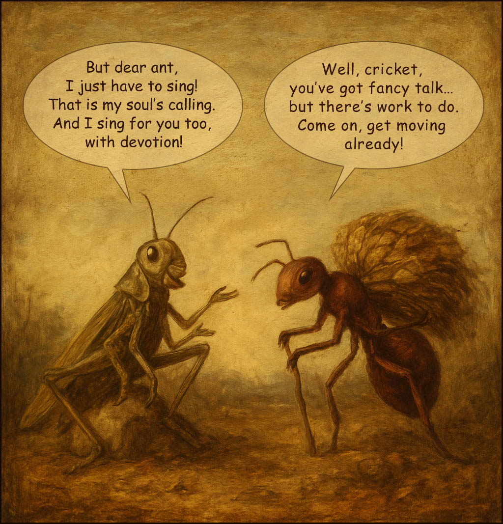 The fable in verse about the cricket and the ant by Jean de La Fontaine (originally a fable by Aesop) is moralistic: the ant works hard during summer to store provisions for the coming winter, while the cricket merely sings in the sunshine. Those who do not work shall not eat, the story tells us. Yet between these small creatures lies a deeper tension: between doing and Being, between duty and inspiration, between practical living and the art of living itself.