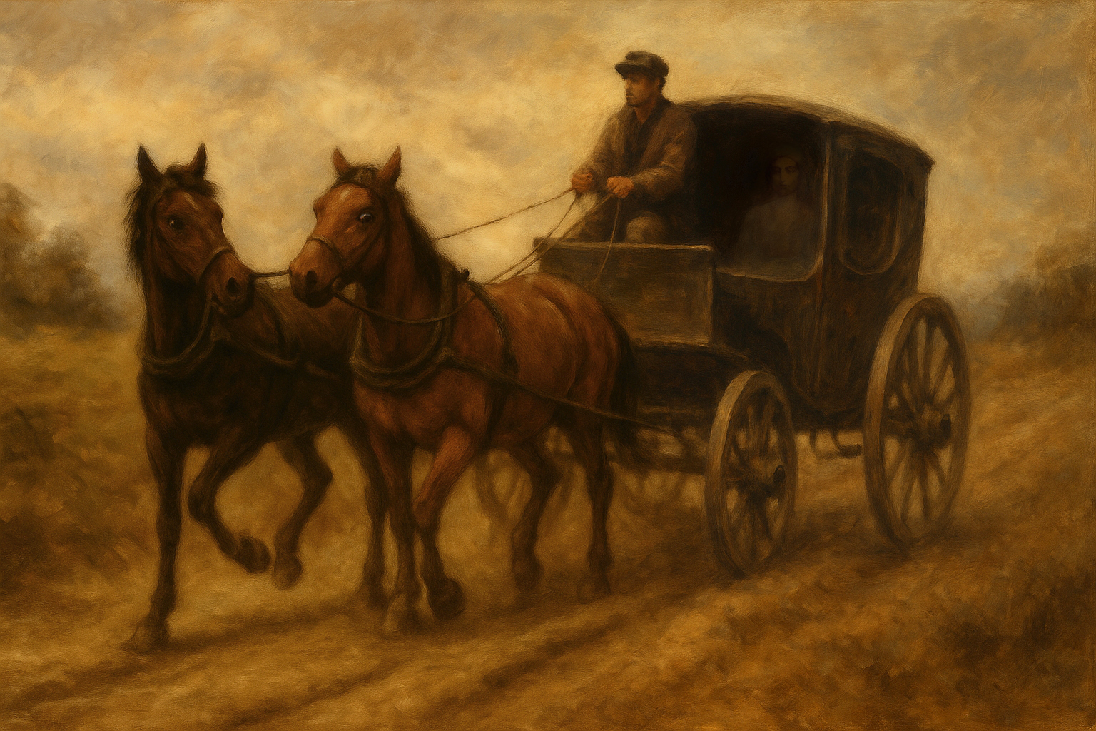 Maar er is nog meer mis… De paarden kunnen vrijwel ongeleid alle kanten op gaan. Ze zijn onwillig, onrustig of gestrest, en regelmatig bokkig. Hierdoor raakt de koets telkens van het wagenspoor af, waardoor dit toch al krakkemikkige ding op oneffen terrein komt en het zwaar te verduren krijgt.